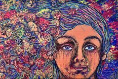 Her work often features expressive brushwork and a vibrant color palette, bringing a dynamic energy to each piece. For instance, in her self-portrait “Run a Brush Through That Hair” the swirling, fragmented strokes that make up the figure’s hair are chaotic and multidirectional, creating a storm of color, faces, and forms. These vigorous strokes suggest mental overwhelm, as if thoughts and memories are spiraling uncontrollably. The hair, rather than being a passive element, becomes a psychological space filled with noise, conflict, and suppressed trauma—each face representing a different emotion or internal voice.